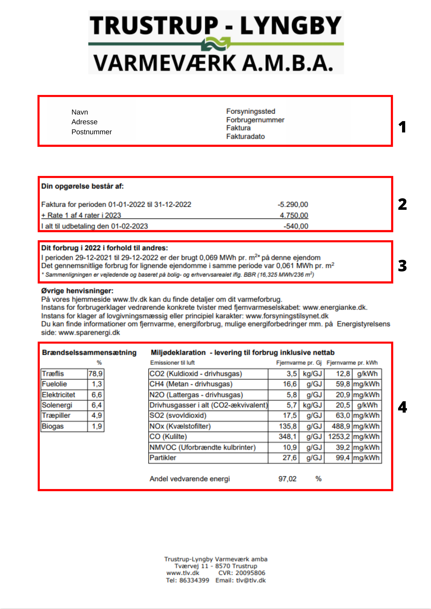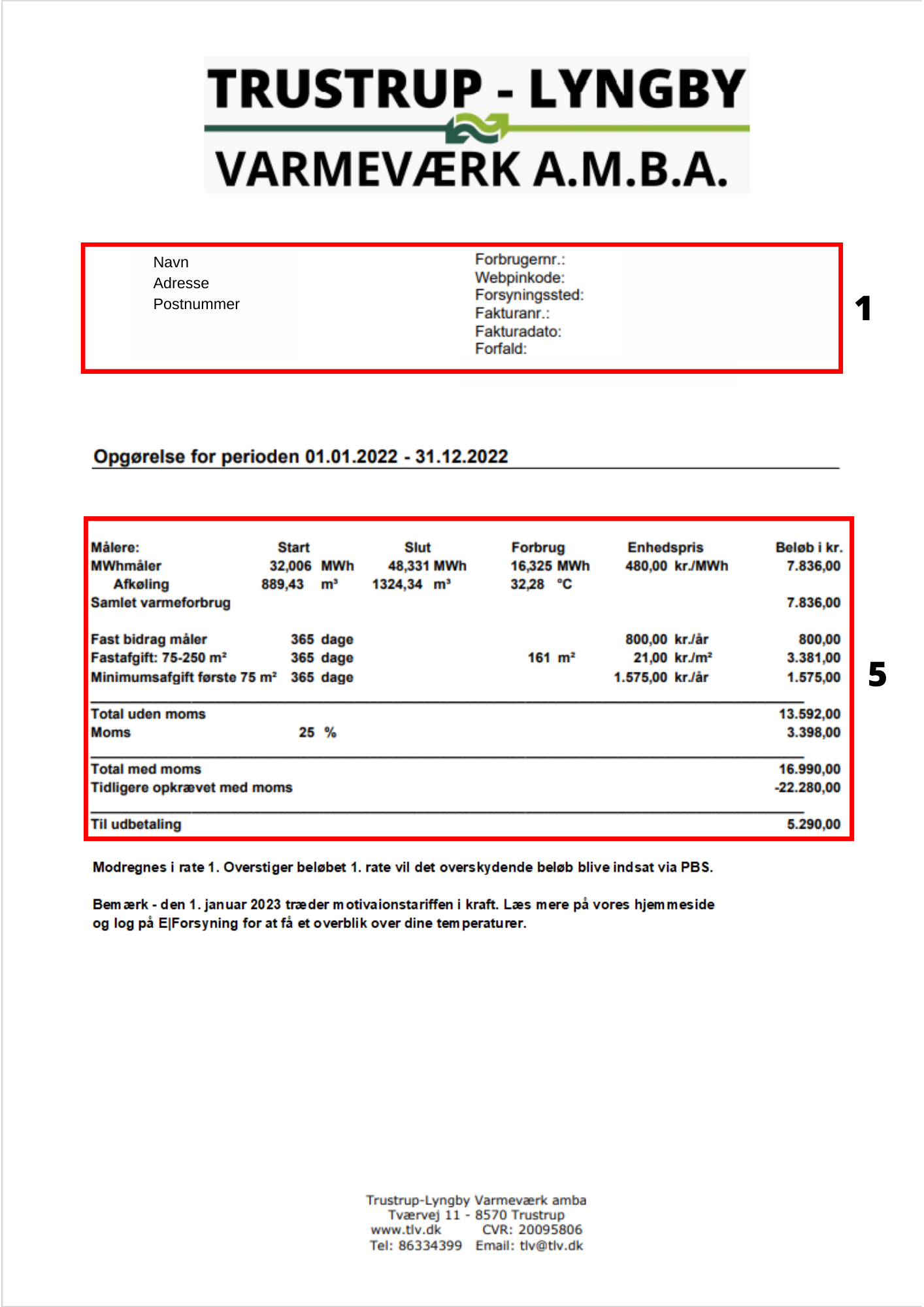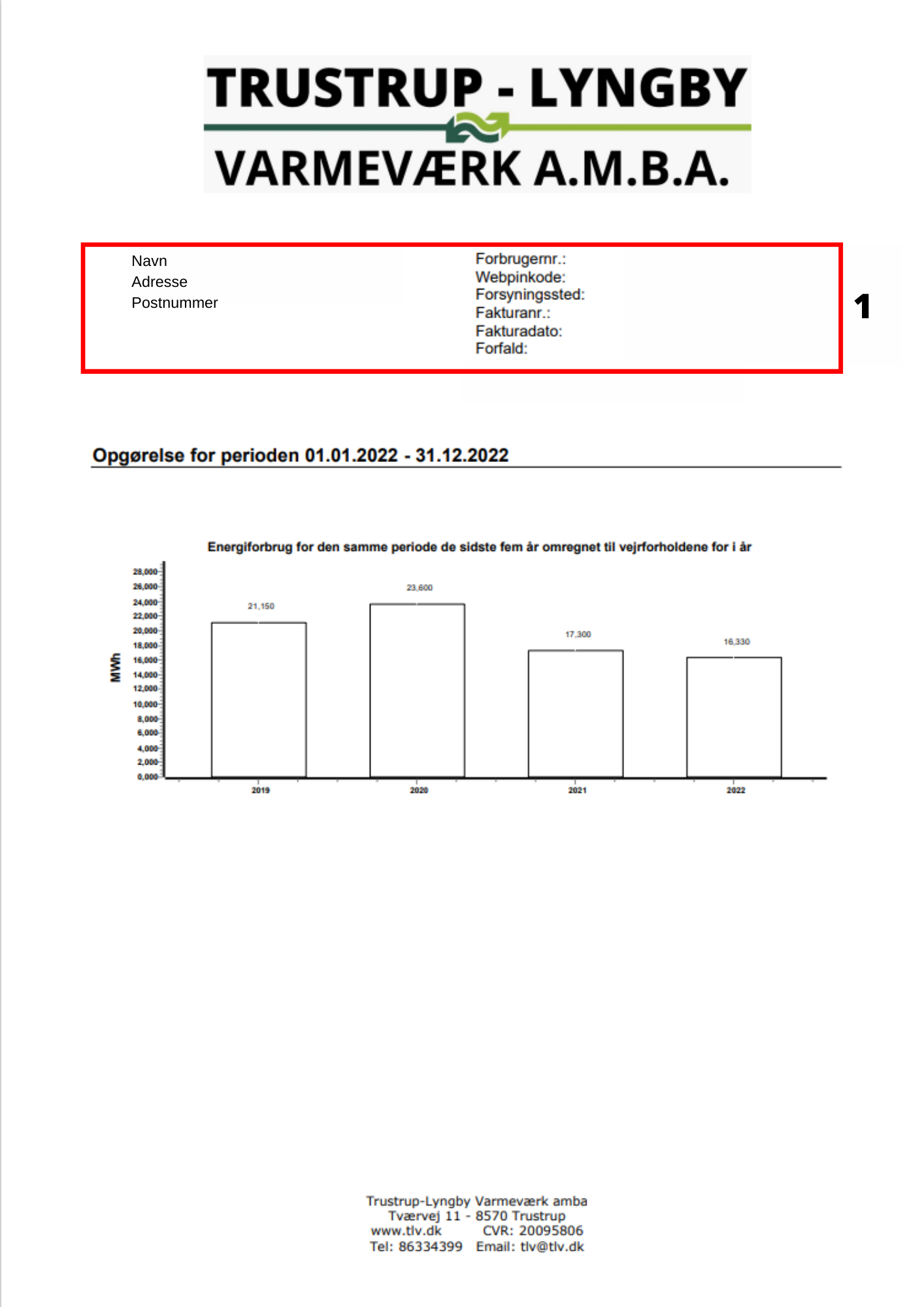 Her ses opgørelsen for hvor mange MWh måleren stod på ved årets start samt ved årets slut = forbrug. Herudover prisen pr. MWh (Enhedspris), som er forskellig alt efter hvilket forsyningsområde, du bor i - se mere herom i vores tarifblad Prisblad 2022 (tlv.dk).